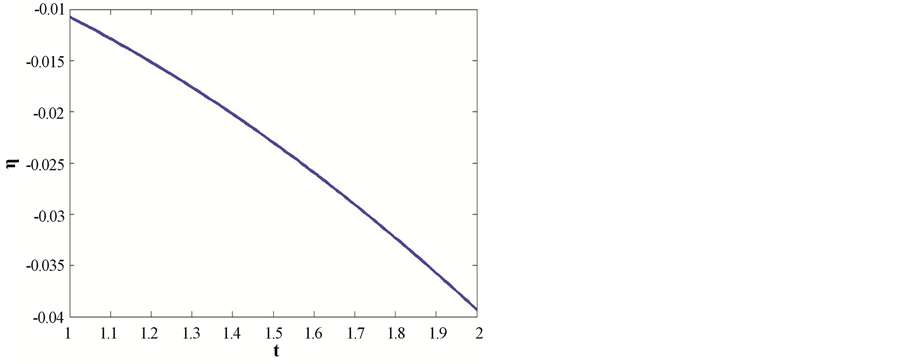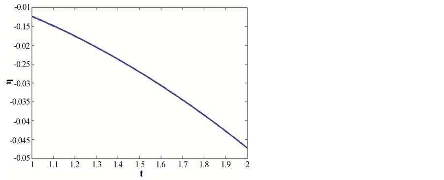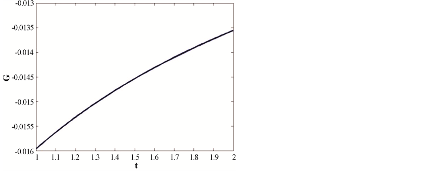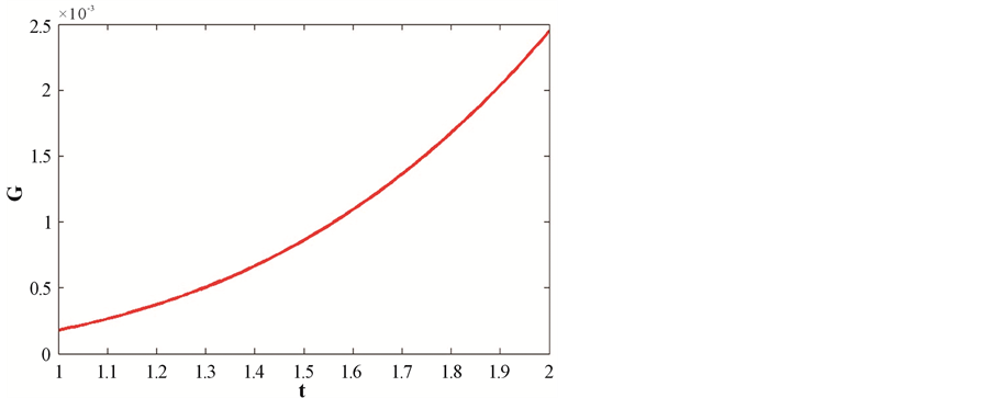 Figure 5. This figure shows variation of gravitational constant with respect to cosmic time t. Here we consider B = 1, C = 1, n = 1.5, m = 2,