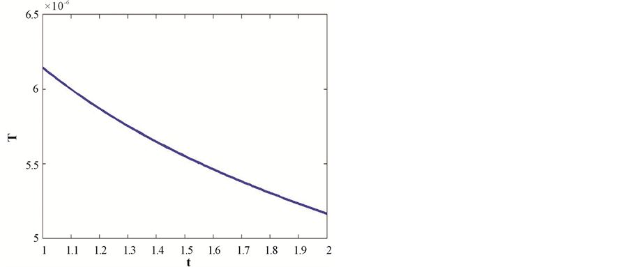 Figure 8. This figure shows variation of temparature with respect to cosmic time t. Here we consider B = 1, C = 1, n = 1.5, m = 2 and