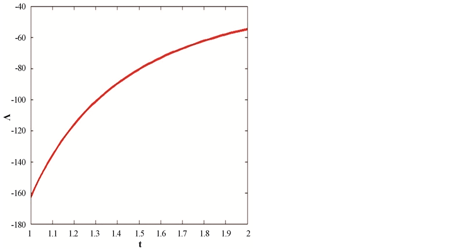 Figure 3. This figure shows variation of cosmological constant with respect to cosmic time t. Here we consider B = 1, C = 1, n = 1.5, m = 2,
