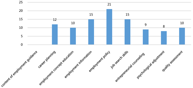 Employment guidance content focuses on career planning, employment concept education, employment information, employment policy, job search skills, entrepreneurial counseling and other content, less involved psychological adjustment, evaluation of the quality of college students and other content. Lack of special counseling and effective guidance on the individual characteristics of students and the specialties of local college students, the development of potential, the cultivation of entrepreneurial innovation ability, the guidance of employment concept and value orientation and the career planning, the guidance is not so effective. The content of most employment guidance is relatively simple. This simple and narrow guidance ignores the potential development of individual and limits interaction (Figure 1).