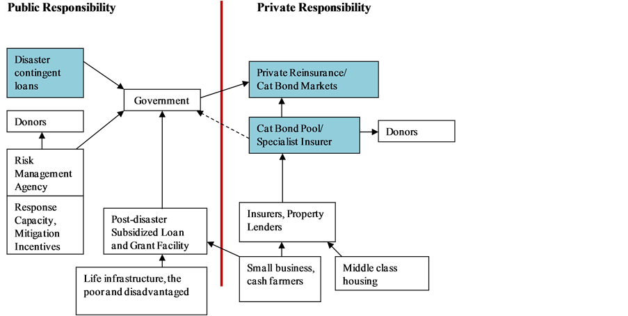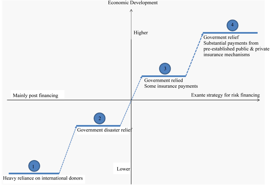 lower after a series of other large-scale disasters. If only relying on international donors, it is a very uncertain strategy for countries. In Level 2, ex-post funding is mainly from the central government. The central government raises the level of revenues through taxes increases thus post-disaster funding from the central government is faster relief compared with Level 1 countries. Michel-Kerijan et al. (2011) [2] think that the level of technical expertise in risk management in these countries is usually higher but still limited. In Level 3, as the level of economic development improvement, ex-post funding is mainly from the central government but there is some coverage by insurance systems. At this level, public insurance, private insurance, and micro-insurance are present but private insurance penetration is still low. The level of technical expertise in risk management in these countries is also often higher than in Level 2. However, the disaster coverage solutions developed in these countries is often quite basic and the private markets do not have the both capital base and expertise to insure concentrated portfolios of risks. In Level 4, often in rich countries and highly economic development countries, significantly high insurance and reinsurance penetration are against natural disaster and government supplements by allocating catastrophic risk capital. Governments still play important roles in providing some types of insurance (reinsurance) for truly catastrophe risks. The risks are generally covered by both public and private sector. Actually, many rich countries (e.g., the United States, Japan, Germany, France and the UK) have developed catastrophe financing solutions based on public-private partnership which the insurer provides insurance coverage for a given type of catastrophe and governments agree to take steps to mitigate that risk across the country.