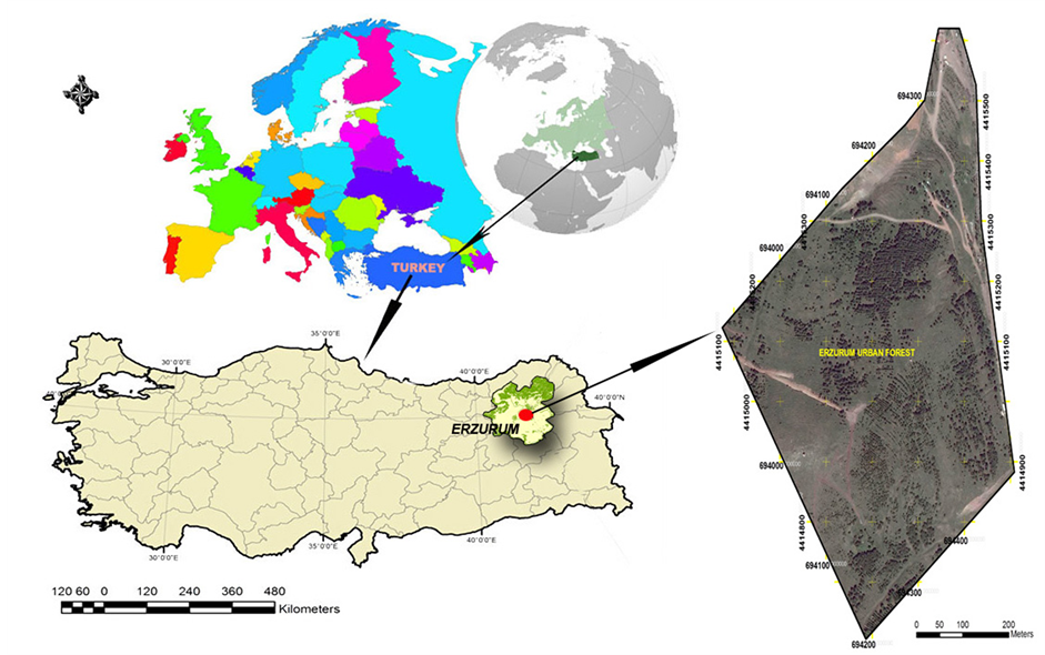 Study Area: Erzurum Urban Forest is located 5 km South West of the city center of Erzurum (Figure 1). The park is situated on steep with an area of 717 ha. The forest, surrounded by both planted and natural woodlands, which are mainly Pinussylvestris and Betula pendula and Salix alba. In this urban forest, approximately 1075.5