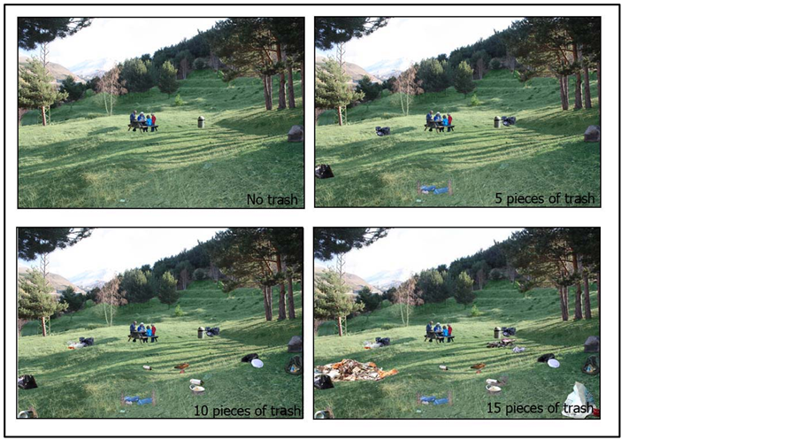 Many of these indicators have quantitative characteristics such as “time sent searching for a parking space”; therefore, the levels of them can be measured with a numerical scale. Besides this, two indicators (degree of shading in picnic grounds and cleanliness) have qualitative characteristics. In such cases, computer simulation modelling is used to measure these indicators, which involves using software to manipulate and create visuals [44] [45] . Visuals provide a realistic and cognitively easy assessment of indicators so they provide convenience for respondents to choose conditions that would be like [46] [47] . This technique have widely preferred for describing environmental or social indicator impacts [26] [44] [46] [48] - [51] . Computer simulation modeling was used to prepare two series of photographs which represent two qualitative indicators; shading and cleanliness range. The number and size of thrashes in the images were measured by 4-color-photographs representing level of cleanliness of the site. The number of trashes was detected at four different levels, which increase arithmetically. The cleanliness simulation series were presented in Figure 3. The second simulation series, represented the shading indicator levels, were also prepared with the same technique.