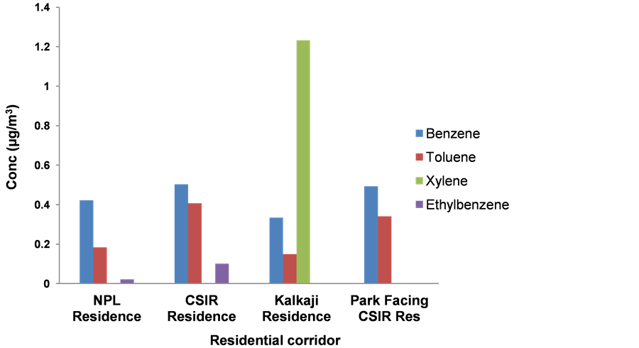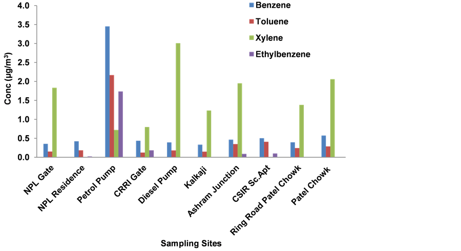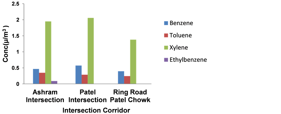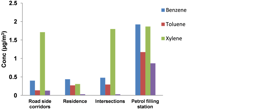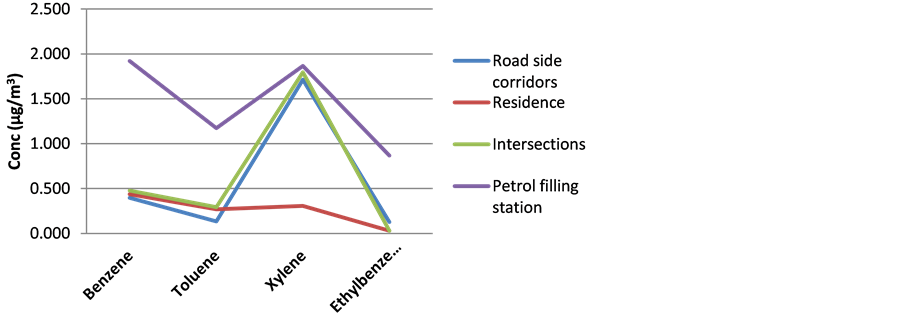 resulted in higher concentration of benzene and toluene at residential sector than road side corridors. However, xylene concentration was dominant at road side (1.713 µg∙m−3), traffic (1.797 µg∙m−3) and petrol filling stations (1.866 µg∙m−3) suggesting of some common source for all of them (Figure 4). Ethylbenzene was detected at petrol filling station (0.868 µg∙m−3), road side corridors (0.128 µg∙m−3), intersections (0.030 µg∙m−3) and residence (0.031 µg∙m−3). Ethyl benzene could not be detected at all the locations since it is very photo chemically active.