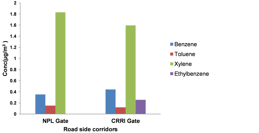 Figure 5 shows the presence of higher concentration of benzene and ethyl benzene at CRRI gate (0.442 and 0.353 µg∙m−3). The higher conc. of benzene at CRRI gate is possible due to the presence of higher traffic density at CRRI Gate as compared to NPL Gate. But higher concentration of xylene and toluene at NPL shows the influence of presence of some industrial source near this location, like NPL is surrounded by industrial area Nariana and other industrial source. Figures 5-8 are plotted between different subcategories of locations road side corridors (CRRI and NPL gate), residential areas (NPL, CSIR and Kalkaji) and traffic intersections (Ashram Intersection, Patel Chowk intersection, ring road Patel Chowk. Relatively lower values at the residential area suggested that the air masses in these have undergone a small degree of photochemical processing. At NPL site (Figure 5), the total VOC levels were low largely because the traffic around this site was relatively low (Table 2). VOC levels were relatively high at Ashram intersections which can be attributed to high and slow moving traffic at these sites. At this frequent idling and deceleration of vehicles is a common feature [9] . Consequently, VOC levels are high at these sites as compared to sites around NPL, where traffic volume is low and free from traffic congestion. The possible reasons for the highest value at this site are: (1) high traffic density resulting in considerable congestion.