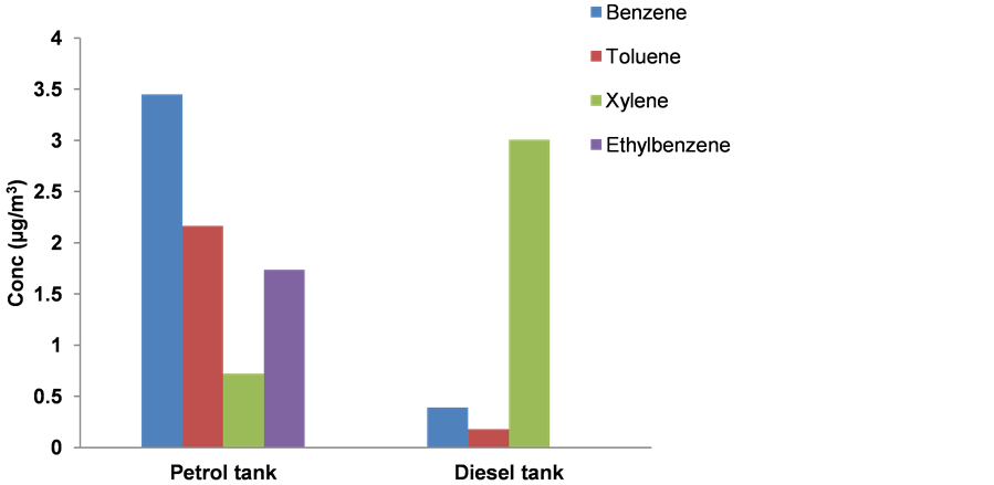To identify the major source of gasoline and diesel vehicles the adsorbent were kept directly over the petrol pumps and diesel pumps. The results of this observation showed that at diesel pump the concentration of xylene was higher and at petrol the concentration of benzene was higher which was expected. Figure 7 shows the concentration profile of BTEX at diesel and gasoline pump and it could be easily identified the presence of xylene dominating near diesel pump. The result also says that gasoline contains ethyl benzene and therefore ethylbenzene could not be detected near the locations where diesel source was more contributing (NPL Gate). From Figures 5-8 it could be easily seen that the ethylbenzene could be detected near Ashram intersection, CRRI Gate, Petrol tank and CSIR residence (same topography). This also confirms that the ethylbenzene is coming from gasoline vapour and xylene from diesel vapour. Source apportionment study using chemical mass balance (CMB) model carried out by Anjali et al. [13] [41] indicate that emissions from diesel internal combustion engines dominate in Delhi. The exhaust of gasoline and diesel automobiles contains significant concentrations of VOCs, the most important of which are benzene, 1 - 3 butadiene, m & p-xylene, ethylbenzene, toluene and formaldehyde. Fuels used in vehicles are petrol (gasoline), compressed natural gas (CNG) and diesel. All taxis, buses and three wheelers use CNG as fuel. Influential species in case of diesel engine exhaust were benzene, ethylbenzene, xylenes, propane, n-decane and undecane and in case of gasoline vehicle exhaust influential species were benzene, ethylbenzene, 1,2,4- methylbenzene, 1,3,5-methylbenzene, n-hexane and 2-methylhexane.