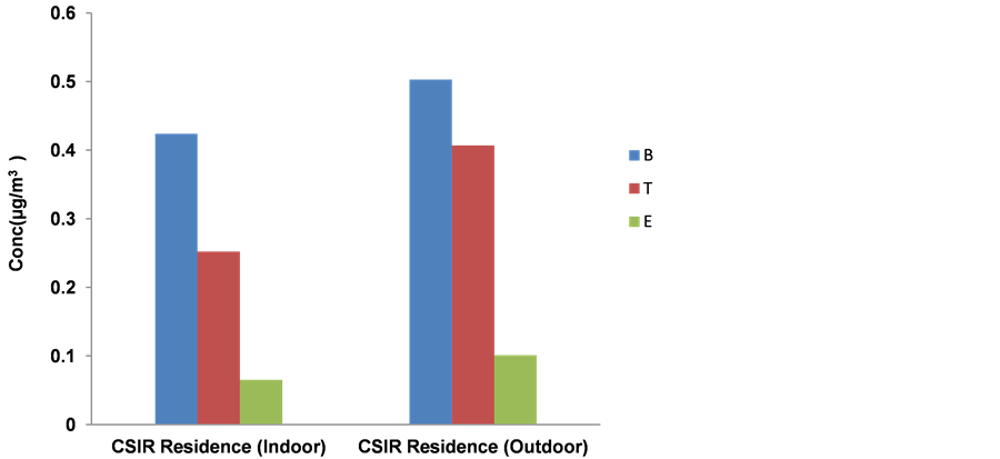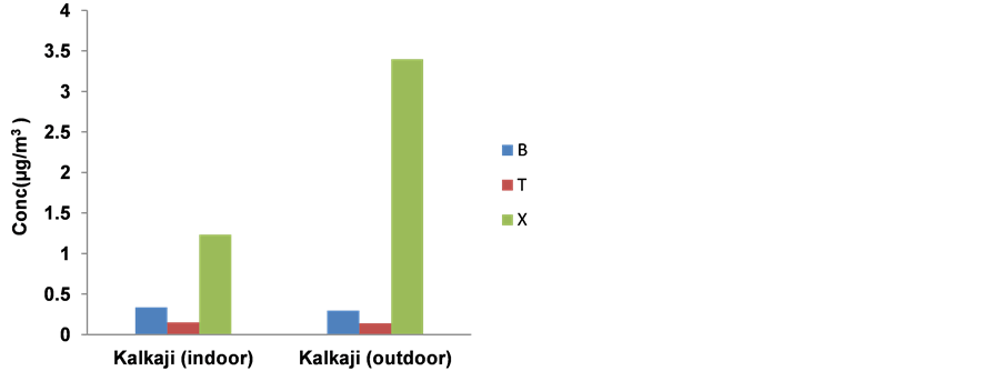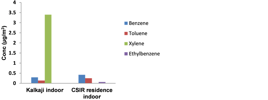The study was also carried out for measuring indoor air pollution at CSIR and Kalkaji Apt, and the result shows that the outdoor concentration is larger than the indoor concentration in both the locations (Figures 9-11). The comparison between CSIR and Kalkaji residential shows that the xylene is dominating Kalkaji area whereas at CSIR area xylene could not be detected (Figure 9). The interesting observation was that the xylene was present in Kalkaji, whereas ethylbenzene could not be detected, however at CSIR apt we could detect only benzene, toluene and ethylbenzene. The result is as expected because at Kalkaji area, where the adsorbent was kept is a pure residential area where in every house there is a generator which runs on diesel and therefore diesel component xylene was detected both indoor and outdoor whereas at CSIR residence the topography is totally different and this region is mainly affected by major traffic only and therefore the characteristics of pollutant present is similar to that of intersections. The presence of ethylbenzene at the residential also confirms the effect of vehicular source near residential area. As it can be seen from Table 3, some groups of monitoring stations had similar benzene to toluene ratios, which can indicate identical sources of these compounds in the atmospheric