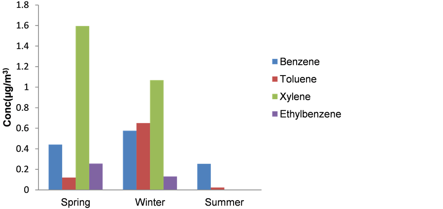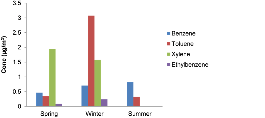 the winter season due to slow down of photochemical reactions as a result of short day length and lower solar intensity. Several researchers have reported that during winter, meteorological conditions are not suitable for O3 build-up. Relatively high solar intensity and ambient temperature are extremely suitable for the formation of tropospheric ozone formation by consuming VOC through photochemical reactions. In winter, on starting, automobiles emit more VOC because of cold engines. The concentration of benzene was lowest in summer (0.25 µg/m3) and maximum in winter (0.66 µg/m3). Xylene concentration was 1.60 µg/m3 in spring and 0.05 µg/m3 in summer season. Toluene was found in the range of 0.70 µg/m3 (winter) to 0.20 µg/m3 (spring). The Fig shows that the concentrations of BTEX are lower in summer and highest in winter and spring season. This may be due to metrological factors. During summer, the dispersion is fast due to high turbulence and temperature, while during winter, due to stable condition and inversion, dispersion is less and accumulation of pollutants occurs. The lower value of benzene and toluene observed in summer could be attributed to their different lifetimes. Both aromatic compounds react only with OH radical during daytime, with toluene reacting significantly faster than benzene. Moreover, chemical removal of VOCs by OH radicals is faster in summer than in winter, as higher radiation and temperature generally facilitate their removal rates.
