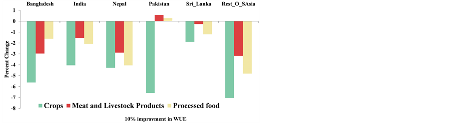 The expansion in food production due to improvement in WUE increases the net exports of food products (crops, livestock products, and processed food) from South Asia (Table 3). Improvement in WUE extends the net exports of food products of South Asian countries except for Sri Lanka. The net exports of food products of this country drops slightly at all levels of improvement in WUE. With a 10 percent improvement