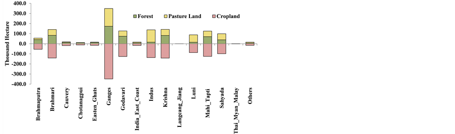 Land and water endowments in India, unlike other countries in South Asia, are scattered across many river basins and different agro ecological zones representing different climate conditions and length of growing periods. Since an improvement in WUE could generate different land use patterns across the country, here we study the land use impacts of improved WUE in India by river basin and AEZ, limiting analyses to the case of 20 percent improvement in WUE. The left panel of Figure 5 shows changes in cropland, forest, and pastureland areas by river basin. This figure indicates that with a 20 percent improvement in WUE, the area of cropland shrinks across all river basins, with major reductions in Ganges (by 349,000 hectares), Krishna (142,000 hectares), Brahmari (141,300 hectares), Indus (137,000 hectares), and Mahi-Tahi (125,000 hectares). In return, the areas of forest and pastureland grow across all river basins.