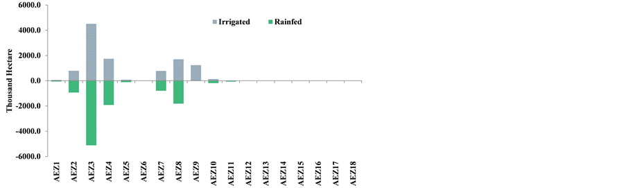 20 percent improvement in WUE. As shown in this figure, irrigated area grows largely in AEZ3 (5.1 million hectares), AEZ4 (1.9 million hectares), AEZ8 (1.8 million hectares), and AEZ9 (1.4 million hectares).