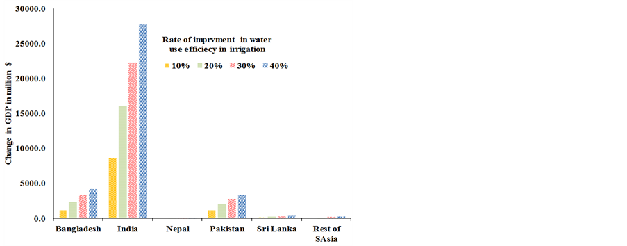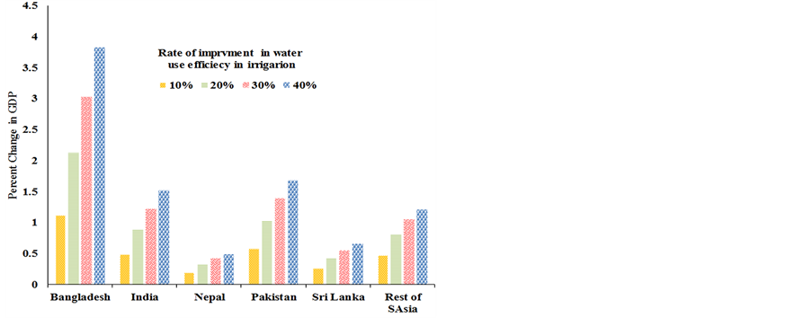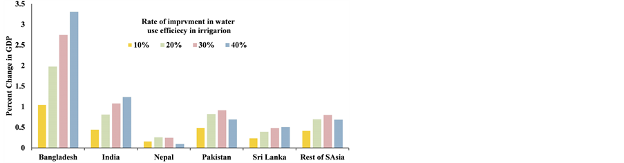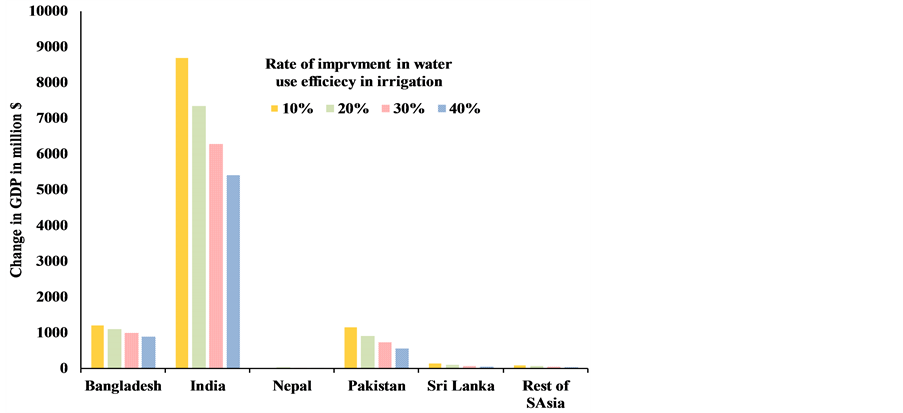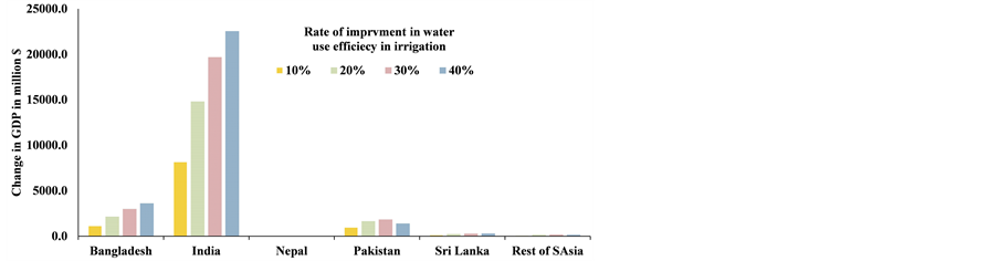 Figure 8. Marginal impacts of different levels of improvement in water use efficiency on GDP of South Asian economies: Improvement in water use efficiency is costless.
