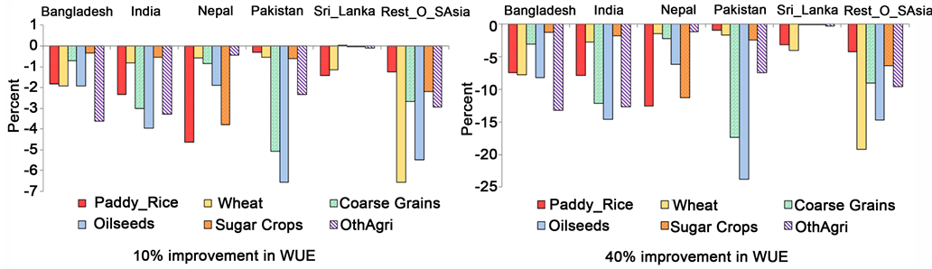Now consider the impacts of improvements in WUE on the production of individual crops (Figure 2). Bangladesh, Pakistan, and rest of South Asia experience larger