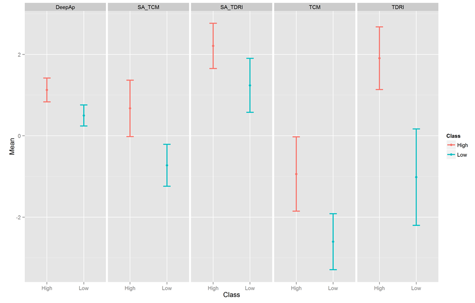 As pointed before, the common language effect size indicates how often a score sampled from one distribution is greater than the score sampled from the other distribution if both are randomly selected (McGraw & Wong, 1992) . Then, considering the common language effect size, the probability that a TDRI score taken at random from the high achievement group is greater than a TDRI score taken at random of the low achievement group is 73.41%. It means that out of 100 TDRI scores from the high achievement group, 73.41 will be greater than the TDRI scores of the low achievement group. The Rasch scores of the other tests have moderate effect sizes. Their common language effect size varied from 64.92% to 70.10%, meaning that the probability of a score taken at random at the high achievement group be greater than a score taken at random in the low achievement group is at least 64.92% and at most 70.10%. Figure 3 shows the mean score for each test and its 95% confidence interval by both classes (low and high).