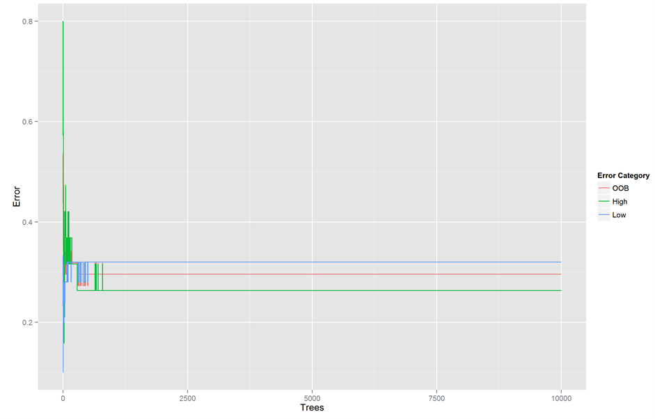 Figure 4. Random Forest’s out-of-bag error (red), high achievement prediction error (green) and low achievement predic- tion error (blue).