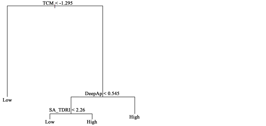 Figure 1 shows the classification tree presented by Golino and Gomes (2014) with three predictors of the academic achievement (high and low) of medicine students: The Metacognitive Control Test (TCM), Deep Learning Approach (DeepAp) and the Self-Appraisal of the Inductive Reasoning Developmental Test (SA_ TDRI). The most important variable in the prediction was TCM, since it was the predictor located at the first