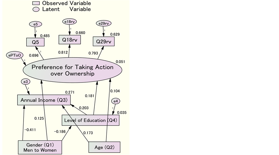 Obtained Cronbach’s alpha for Q5, Q18rv and Q29rv was 0.810. Cronbach’s alpha in this study, 0.810, was sufficiently high. Moreover, Q5, Q18rv and Q29rv could be treated as items that measure a single factor that can be summed as a single scale. It can be confidently stated that these three questions (observed variables) tracked a latent variable as a factor. We named this latent factor “Preference for taking action over ownership (possession)” for Q5, Q18rv and Q29rv, because higher response numbers indicated preference for taking action. A confirmatory factor analysis of the factor and structural equation modeling of the latent variables (SEM/LV) were carried out (by Amos19). The analysis included the attributes of gender, age, level of education, and annual income, which predict the factor, as illustrated in Figure 1.