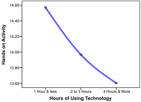 In addition, students’ attitude towards “Hands-on Activity” has indirect significant correlation with number of hours that they spend on technology (Figure 9). That is, as number of technology hours increases, their attitudes towards hands-on activity decrease. Other components did not show any significant relationships with different demographic variables.