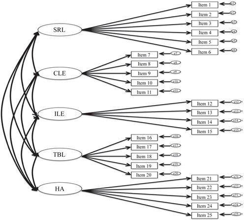 Figure 1. Five Factor Model of Student Attitude toward STEM PBL. (SRL = self-regulated learning, CLE = collaborative learning environment, ILE = interdisciplinary learning environment, TBL = technology-based learning, HA = hands-on activity) (Han & Carpenter, 2014: p. 32) .