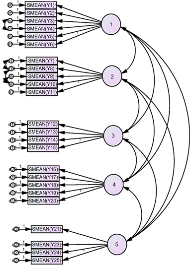 As Table 2 shows, each of the variables or components has a significant correlation with the total of the scale showing an acceptable internal reliability, range from 0.606 to 0.730 at 0.001 significant level. The Cronbach’s Alpha as the reliability of the scale for 25 items was high (α = 0.803). The correlations among factors together were significant but not very high ranging from 0.145 to 0.443. This result suggested that the factors are correlated in general, but each factor is associated with some uniqueness.