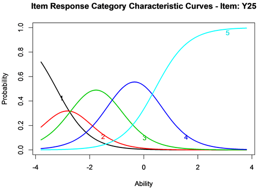 Figure 3. Item Response Category Characteristic Curves of Item 25 in the STEM-PBL Questionnaire: The curves in black, red, green, blue, and aqua blue are item difficulties for boundaries of choices from one to five respectively.