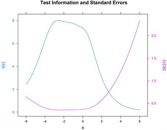 Figure 5. Test information function (the blue line) and the standard error of measurement (the red line) in KADS-11.