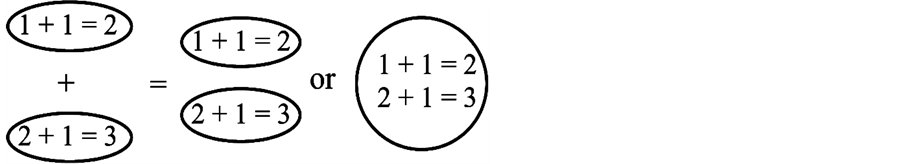 Let some human only understand that 1 + 1 = 2. If somebody teaches that certain individual that 2 + 1 = 3 clearly this information package is different from 1 + 1 = 2. The human being who has been taught that 2 + 1 = 3 has gained knowledge package, they now know that not only 1 + 1 = 2, but also that 2 + 1 = 3. There is a discrete gain in knowledge. The increased gain in knowledge can be represented as two information packages 1 + 1 = 2 and 2 + 1 = 3, or as one knowledge package represented by 1 + 1 = 2, 2 + 1 = 3 as illustrated in Figure 1.