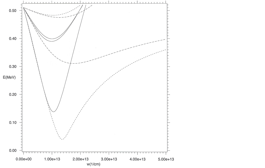 Figure 1. Dirac energies versus variational parameter w from Equation (13b). The proton model comprises the three lower curves as follow. Short dashed: radiant positron 1 energy versus variational parameter w. Long dashed: radiant positron 2 energy versus variational parameter w. Solid: radiant electron energy versus variational parameter w. The neutron model comprises the upper four curves as follows. Short dashed: radiant positron 1 energy versus variational parameter w. Long dashed: radiant positron 2 energy versus variational parameter w. Upper solid: radiant electron 1 energy versus variational parameter w. Lower solid: radiant electron 2 energy versus variational parameter w. The more steeply rising energy curves on the right sides of the minima reflect a larger degree of repulsive spin-orbit coupling, which for an attractive V is repulsive and for a repulsive V is attractive for