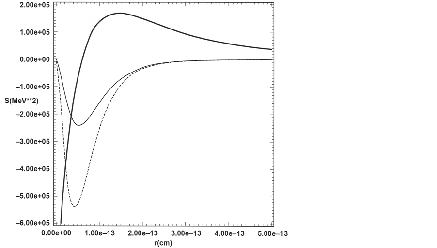 Figure 2. Proton model with reference to Equations (18) and (19) and Table 1. Light solid (curve 1): S(r) in Equation (18b) versus r corresponding to the minimum of radiant positron 1 energy in Figure 1 for radiant-particle variational parameter w' = 3.5w and for negative-imaginary energy inferred from Equation (19) for n = 0 equal to 0.315 GeV. Dashed (curve 2): S(r) in Equation (18b) versus r corresponding to the minimum of the radiant positron 2 energy in Figure 1 for radiant-particle variational parameter w' = 2.7w and for negative-imaginary energy inferred from Equation (19) for n = 0 equal to 0.520 GeV. Thick solid (curve 3): S(r) in Equation (18b) versus r corresponding to the minimum of the radiant electron energy in Figure 1 for radiant-particle variational parameter w' = 2.2w and for negative-imaginary energy inferred from Equation (19) for n = 0 equal to 0.103 GeV. S(r) is calculated from the sum of interaction terms given on the right side of Equation (18b). Curves 1 and 2 go into the origin by cancellation in the first terms on the right side of Equation (18b) comprising one repulsive and one attractive interaction for each curve. The cancellation of interaction terms finite at the origin occurs only because the same w is used for all three radiant-particle trial wave functions. Curve three has a different shape due to the sum of two at- tractive interactions.