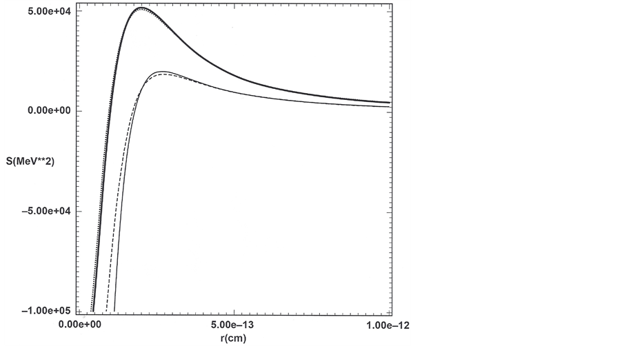 Figure 3. Neutron model with reference to Equations (18) and (19) and Table 2. Long dashed: S(r) in Equation (18b) versus r corresponding to the minimum of the radiant positron 1 energy in Figure 1 for radiant variational parameter w' = 1.2w and for negative-imaginary energy inferred from Equation (19) for n = 0 equal to 0.315 GeV. Light solid: S(r) in Equation (18b) versus r corresponding to the minimum radiant positron 2 energy in Figure 1 for radiant-particle variational parameter w' = 1.0w and for negative-imaginary energy inferred from Equation (19) for n = 0 equal to 0.520 GeV. Thick solid: S(r) in Equation (18b) versus r corresponding to minimum radiant electron 1 energy in Figure 1 for radiant-particle variational parameter w' = 2.2w and for negative-imaginary energy inferred from Equation (19) for n = 0 equal to 0.103 GeV. Short dashed: S(r) in Equation (18b) versus r corresponding to the minimum of radiant electron 2 energy in Figure 1 for radiant- particle variational parameter w' = 2.3w and a positive squared energy of 0 such that the zero-energy state is unstable against dissociation into a bare electron and neutrino with lifetime of 1.15 × 103 s. As the squared energy well becomes narrower, negative squared energy states stable against dissociation are popped into the squared positive energy region unstable against dissociation. All curves have the shape of curve 3 in Figure 1 due to the sum of one repulsive and two attractive interactions for each radiant particle.