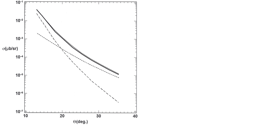 tum transfer, such that, as shown in Figure 4, the Coulombic interactions are dominant at the small angles and the magnetic interaction is dominant at the large angles. The two contributions add coherently to give the total cross section, which is compared with the measured cross section [12] . The theoretical results for the lower beam energies of [12] are not as good due to an overestimation of the Coulombic contributions at the small an- gles. The beginning of this disagreement is seen in Figure 4 due to too rapid a rise in the Coulombic contribu- tion at the smallest angles.