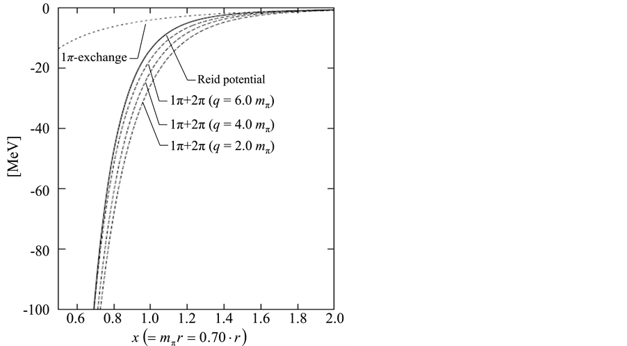 In Figure 1, we show the comparison between the calculated potential due to the two pion exchange processes and the Reid potential. They agree with each other in a quantitative level.