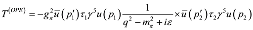 and thus there is no suppression any more, in contrast to the one pion exchange potential case. In addition, one sees that the ladder contribution of Equation (4.2) can only take into account the intermediate states which are always described in terms of the non-relativistic wave functions in the Lippmann-Schwinger equation, and the OPEP is obtained only after one has taken the expectation value of the γ5 with the free Dirac states.