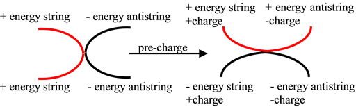 During the coalescence, the positive energy string and the negative energy antistring intersect at the middle as Figure 1, where string and antistring join and split as in conventional string theory. The combination of one half of the positive energy and one half of the negative energy antistring form a new string. As a result, there are two new strings with the top half and with the bottom half of Figure 1. The top half is transformed into a new positive energy string, while the bottom half is transformed into a new negative energy string. The way to achieve such transformations is through the emergence of pre-charges in the charge transformation. In the top half of the figure above, a positive charge (e+) emerges in the positive energy string, and a negative charge (e−) emerges in the negative energy antistring to transform the negative energy antistring into the positive energy antistring, resulting in the positive energy antistring with negative charge. The new string from the top half includes the positive energy positively pre-charged string and positive energy negatively pre-charged antistring.