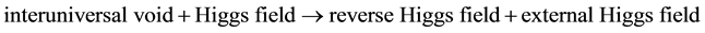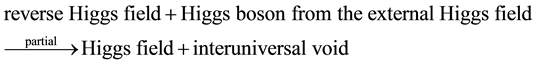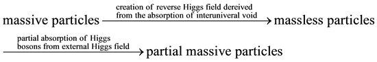 In summary, the two-step process during the Big Bang included (1) the conversion of rest mass (massive particles) into kinetic energy (massless particles) by the creation of the reverse Higgs field derived from the absorption of the interuniversal void outside of the universe and (2) the partial conversion of massless particles into partial massive particles by the partial absorption of the Higgs bosons from the external Higgs field outside of the universe.