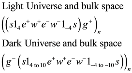 where s, g, e, and w are the strong force, gravity, electromagnetism, and weak interaction, respectively for the observable universe, and where 14 1−4 and 14 to 101−4 to −10 are 4D particle-antiparticle for the light universe and variable D particle-antiparticle for the dark universe, respectively.
