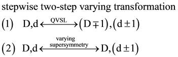 The dark universe involves the stepwise two-step transformation: the QVSL transformation and the varying supersymmetry transformation from 10D4d to 4D4d. (The particles in the 10D dual particle universe are 10D4d.) The QVSL transformation involves the transformation of space-time dimension, D. The varying supersymmetry transformation involves the transformation of the mass dimension number, d, as follows.