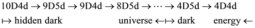 The dark universe consists of two periods: the hidden dark universe and the dark energy universe. The hidden dark universe composes of the >4D particles. As mentioned before, particles with different space-time dimensions are transparent and oblivious to one another, and separate from one another if possible. Thus, >4D particles are hidden and separated particles with respect to 4D particles in the light universe (our observable universe). The hidden dark universe with D > 4 and the observable universe with D = 4 are the “parallel universes”.