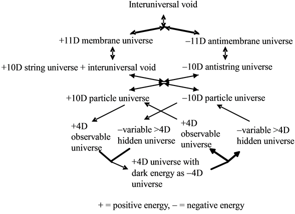 After the maximally connected universe, 4D dark energy transforms back to >4D particles that are not observable. The removal of dark energy in the observable universe results in the stop of accelerated expansion and the start of contraction of the observable universe. The end of dark energy starts another “parallel universe period”. Both hidden universe and observable universe contract synchronically and equally. Eventually, the Big Crush-deflation occurs in the light universe to reverse to the positive energy 10D particle universe. Meanwhile, the dark universe is transformed into the negative energy 10D particle universe. The dual universe can undergo another cycle of the light-dark dual universe. On the other hand, both universes can undergo the reverse charge transformation to become the 10D dual string universe, which in turn can return to the 11D dual membrane universe that in turn can return to the interuniversal void as in Figure 4.