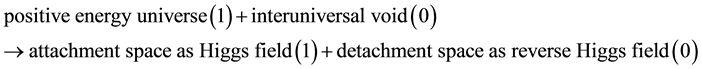 The multiverse can be considered as the digital multiverse consisting of +1 for positive energy universe, −1 for negative energy universe, and 0 for the interuniversal void. The sum in the digital multiverse is 0, so the multiverse is the reversible digital zero-sum multiverse. During the Big Bang, the combination of the positive energy universe as 1 and the interuniversal void as 0 in the digital multiverse led to the digital space structure consisting of attachment space (the Higgs field) as 1 and detachment space (the reverse Higgs field) as 0 in the positive energy universe as in Equation (15).