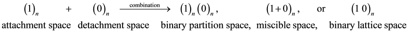 The combination of n units of attachment space as 1 and n units of detachment space as 0 brings about three different space structures: binary partition space, miscible space, or binary lattice space as below.