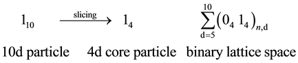 where 110 is 10d particle, 14 is 4d particle, d is the mass dimension number of the dimension to be sliced, n as the number of slices for each dimension, and (04 14)n is binary lattice space with repetitive units of alternative 4d attachment space and 4d detachment space. For 4d particle starting from 10d particle, the mass dimension number of the dimension to be sliced is from d = 5 to d = 10. Each mass dimension is sliced into infinite quantized units (n = ∞) of binary lattice space, (04 14)∞. For 4d particle, the 4d core particle is surrounded by 6 types (from d = 5 to d = 10) of infinite quantized units of binary lattice space. Such infinite quantized units of binary lattice space represent the infinite units (n = ∞) of separate virtual orbitals in a gauge force field, while the dimension to be sliced is “dimensional orbital” (DO), representing a type of gauge force field. The mass-energy in each dimensional orbital increases with the number of dimension number, and the lowest dimension orbital with d = 5 has the lowest mass-energy [11] [18] .