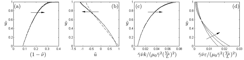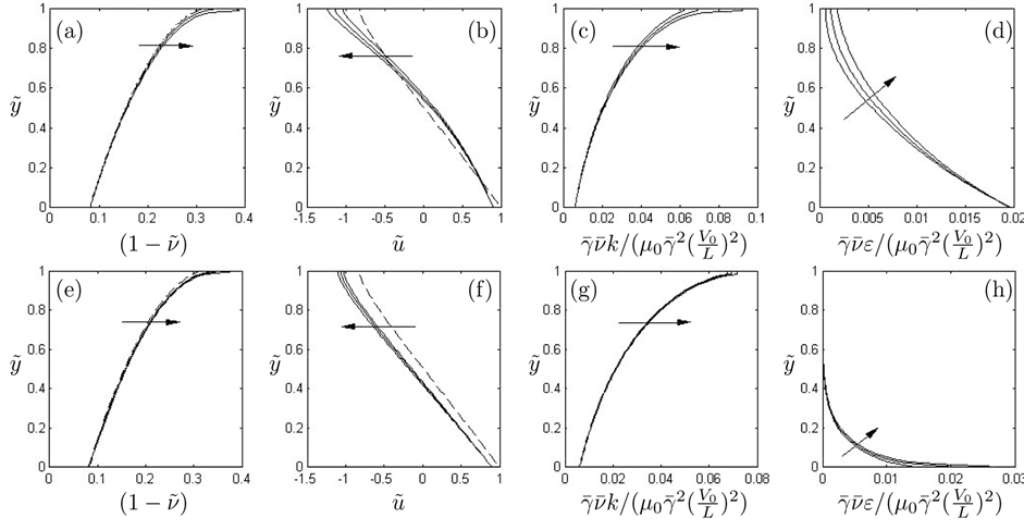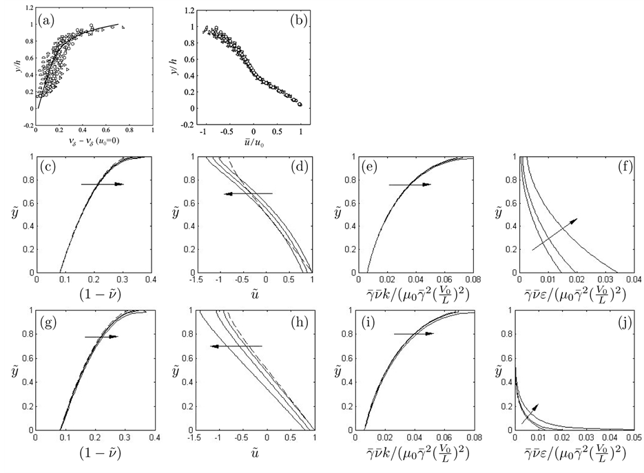 The dimensionless turbulent dissipations, shown in Figure 2(f) and Figure 2(j), decrease from their ma- ximum values on the solid plane toward the minimum values on the free surface with an “exponential-like” tendency in variations in