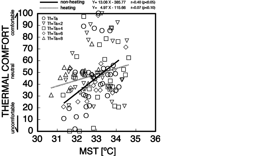 Focusing on the regression line for the indicator of heating by means of heat conduction via the sole of the foot, we found a tendency for whole-body thermal sensation to move toward the hot end in cases where there is heating by means of heat conduction via the sole of the foot when the body is seated in a chair at rest and mean skin temperature is lower than a comfortable 33˚C to 34˚C [31] . The mean skin temperature at which a neither hot nor cold, thermally neutral whole-body thermal sensation is reported is 33.4˚C when there is no heating by means of heat conduction via the sole of the foot and 33.3˚C when there is.