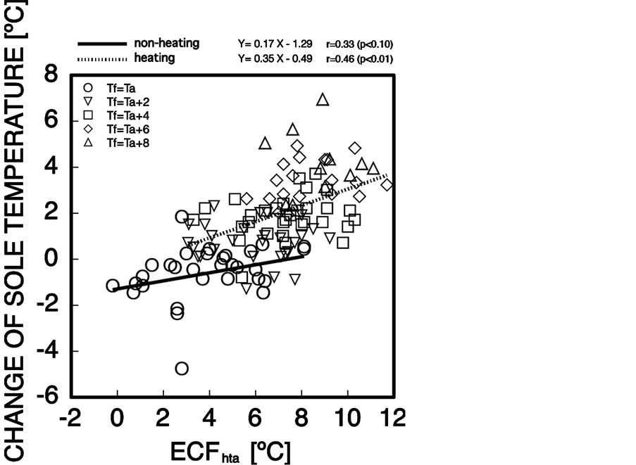 sole-of-the-foot skin temperature. The figure shows the tendency for the change in the sole-of-the-foot skin temperature to increase with ECFhta. The result whereby local heating by heat conduction increases the skin temperature of the extremities is clearly shown.