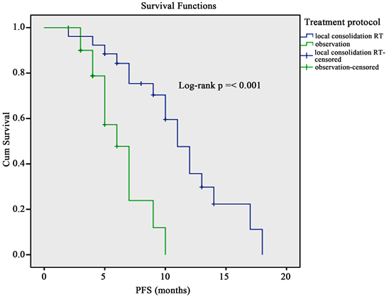 Patients in local consolidation arm had significantly better progression free survival compared with patients in observation group (p ≤ 0.001) Figure 1. Median PFS was 9.5 months (95% CI 7.8 - 11.08) in local consolidation arm and 4.5 months (95%CI 3.9 - 5.7) in observation arm. One year PFS rate was 76.9% in local consolidation arm and 0% in observation arm (all the patients in observation arm were progressed during first year).