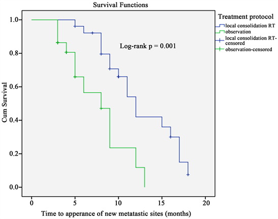 The present study showed that Patients in local consolidation arm had significantly better progression free survival compared with patients in observation group. Median PFS was 9.5 months (95% CI 7.8 - 11.08) in local consolidation arm and 4.5 months (95% CI 3.9 - 5.7) in observation arm. Also, Patients in local consolidation arm had longer median time to appearance of new metastatic sites (10 months CI 9.3 - 12.6) than those patients in observation arm (4.5 months CI 4.2 - 6.9).