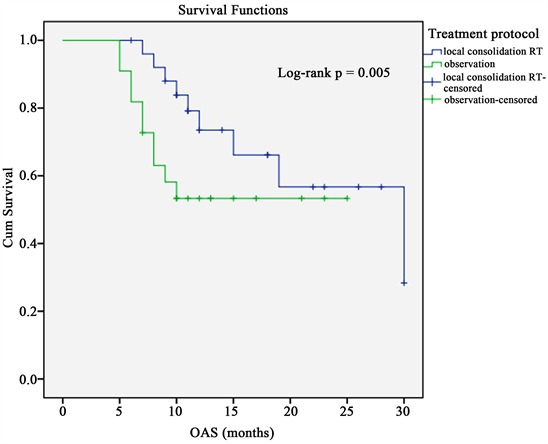 Patients in local consolidation arm had a statistically significant better overall survival than those patients in observation arm (p = 0.005) Figure 3. Median OS of patients in local consolidation arm was 12 months (95% CI 12.1 - 18.01) and in observation arm 10 months (95% CI 8.7 - 13.8). One year OS rate was 42.3% in local consolidation arm and 31.8% in observation arm, 2 year OS rate was 23.1% in local consolidation arm and only 4.5% in observation arm.