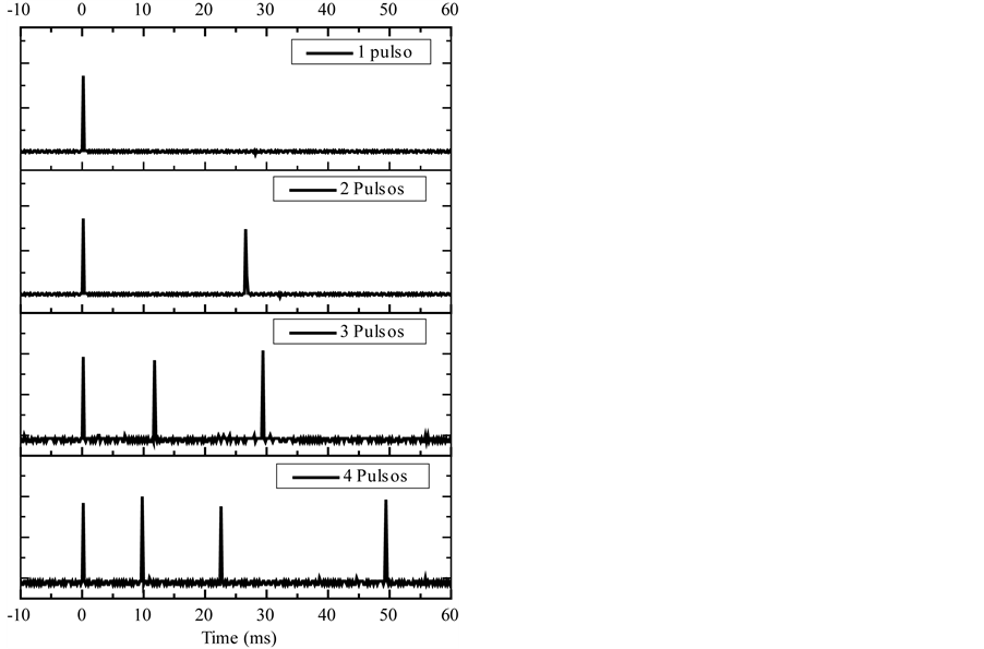 As previously mentioned, the laser generates a pulse train in each shot and for each energy discharge of the lamp. These pulse trains may contain several pulses per shot, with the number of pulses being proportional to the excitation energy. The excitation energy has been limited to ensure only 4 pulses per shot, which facilitates both the characterization of the emission and the study of the plasma excitation.Figure 2 shows the temporal structure of the laser shot for the 2 and 4 pulse cases. The energy per shot according to the number of pulses is 8, 17, 24 and 32 mJ for shots that contain 1, 2, 3, and 4 pulses, respectively.