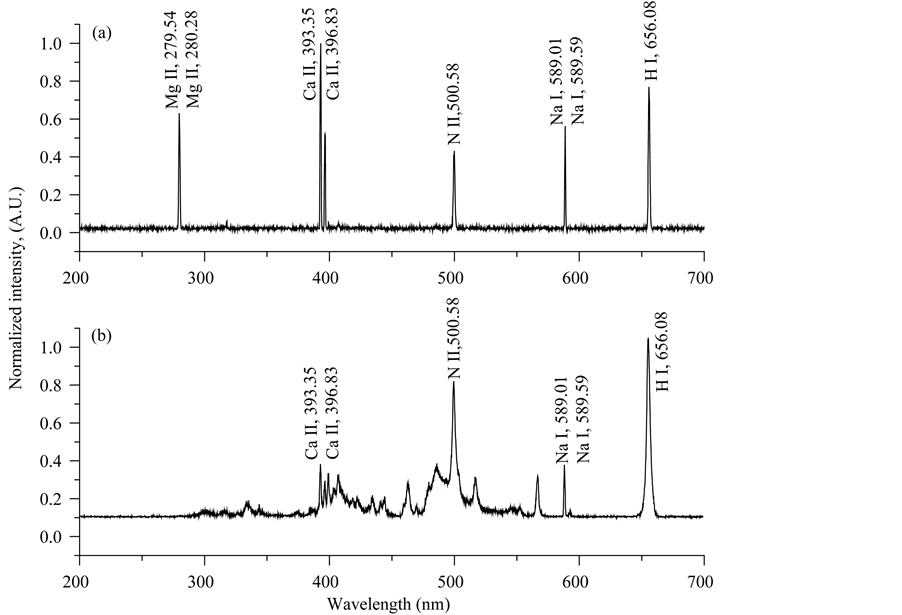Figure 3. Spectrum of two species of bacteria obtained with a pulse shot.(a) Escherichia coli;(b) Staphylococcus aureus.